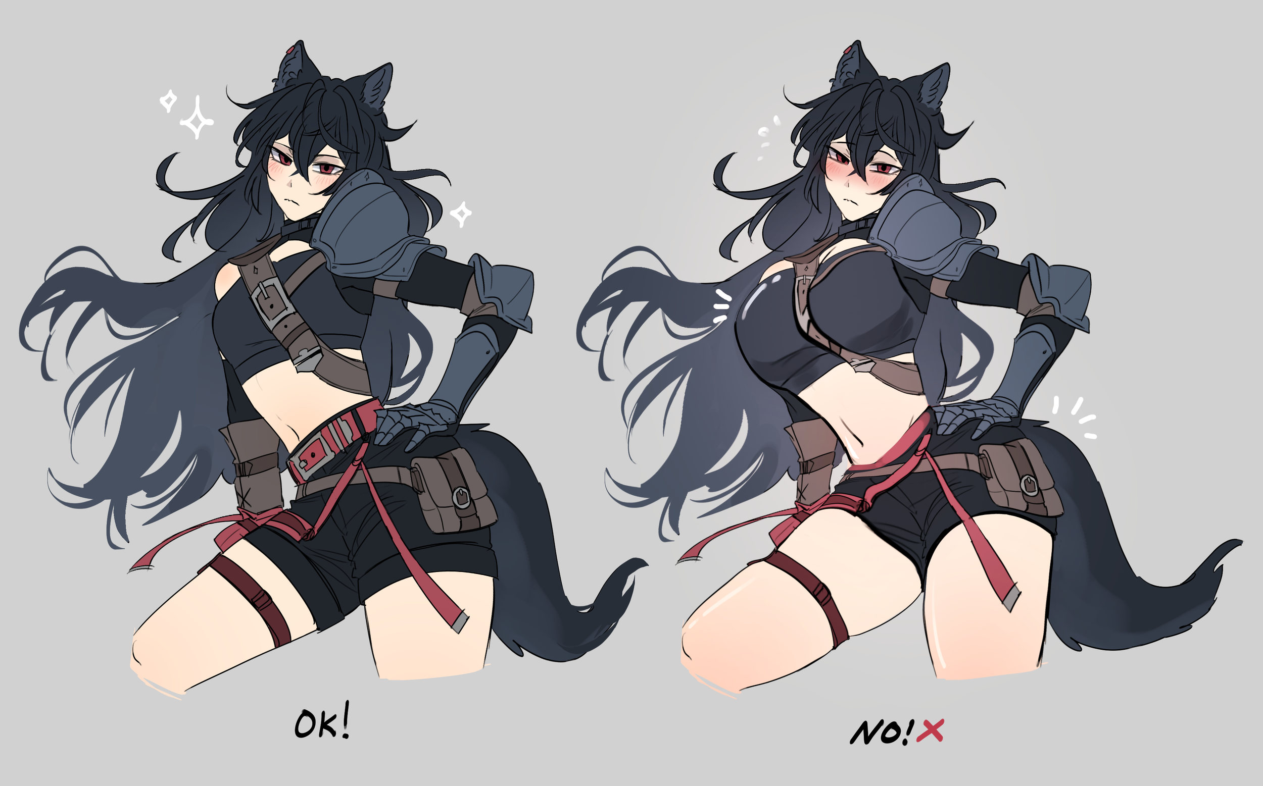 She is a wolf hybrid. Draw her ears however suits your art style, but please avoid making them too cat-shaped ❌🐈❌