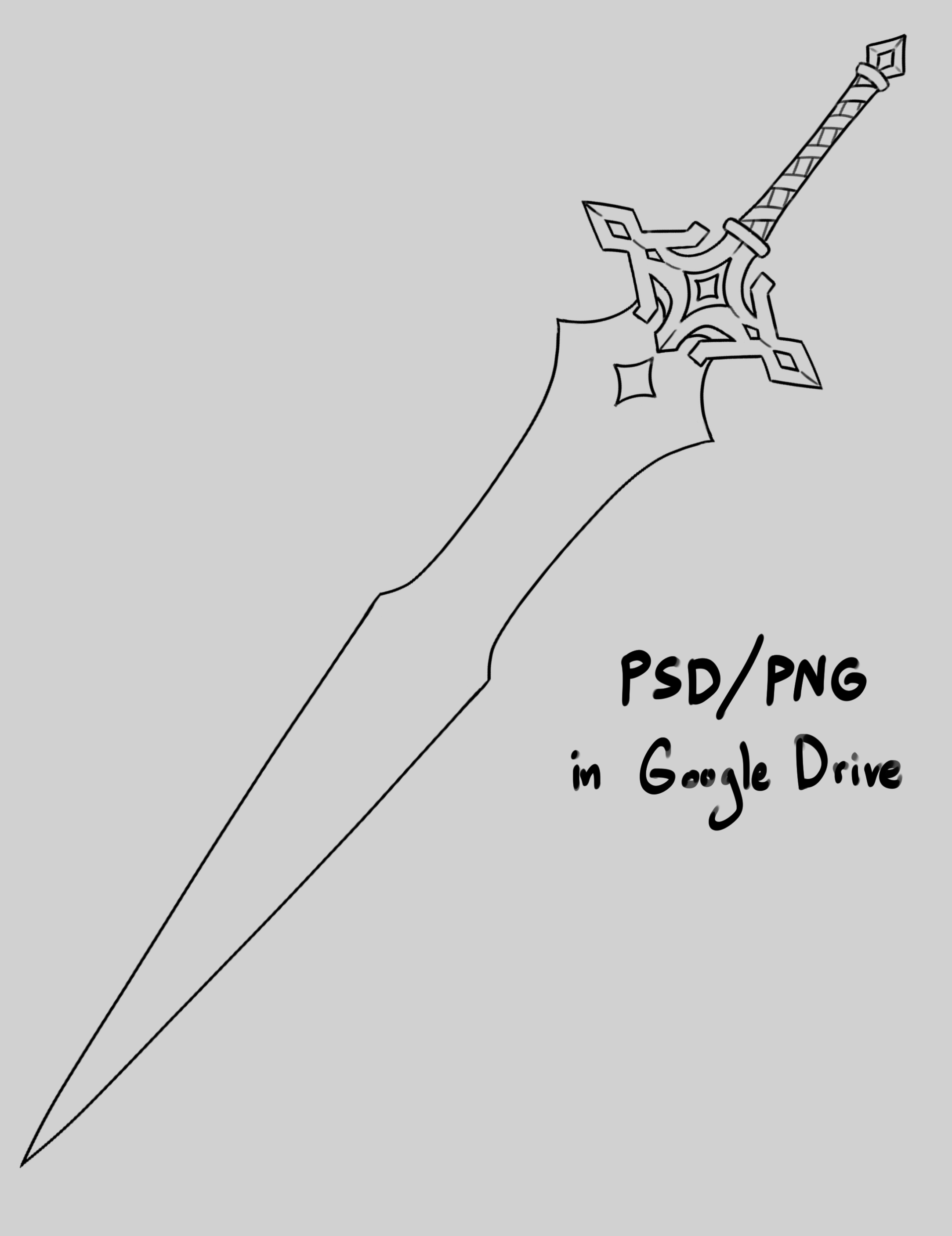 Sword size is a rough estimate. Don’t worry about getting the size right, just know that it’s a very big sword. Also, despite her wearing armor on her left arm, she is right handed.